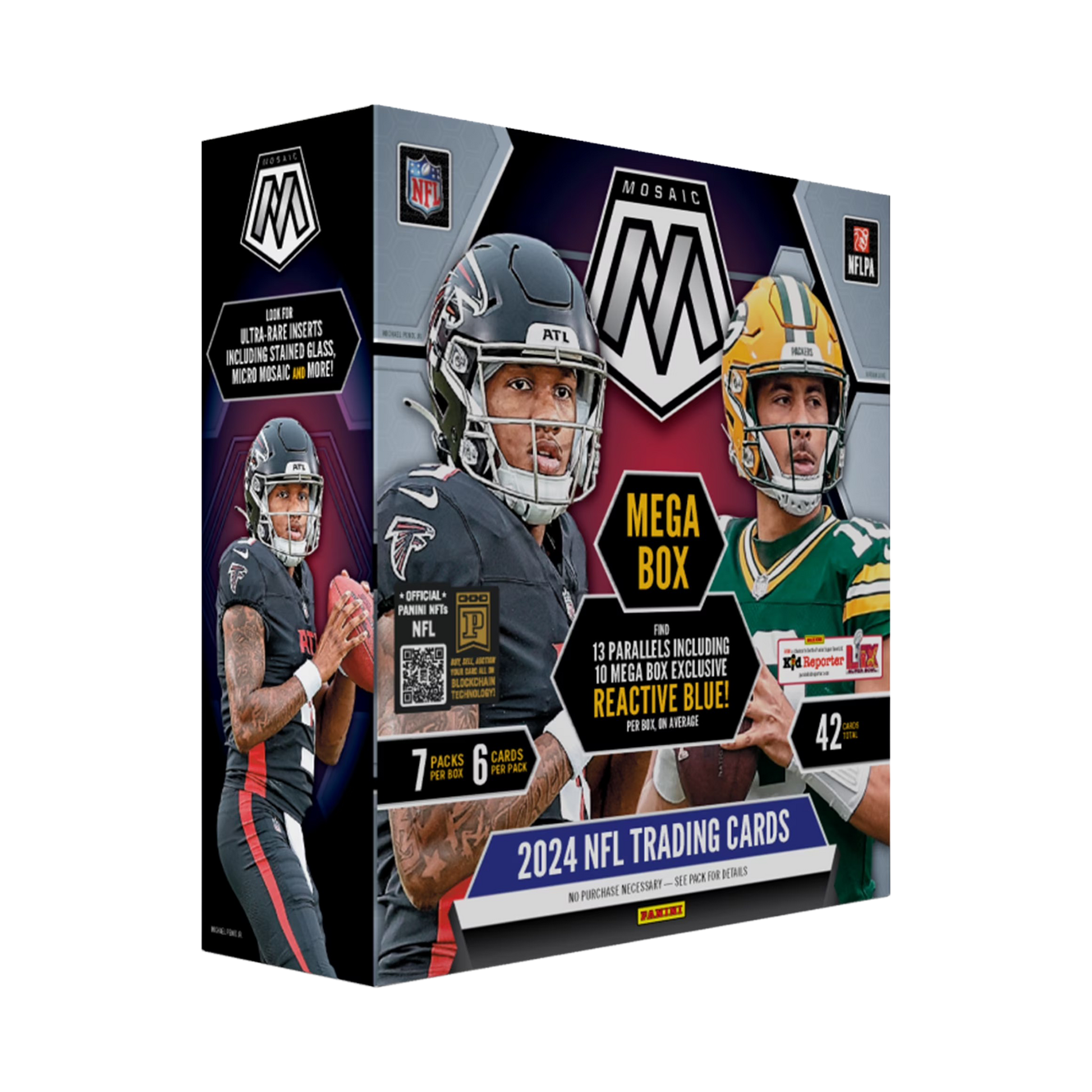 More packs, more Mosaic! The 2024 Panini Mosaic Football Mega Box is your best bet for finding exclusive Mosaic parallels and a deep rookie checklist.