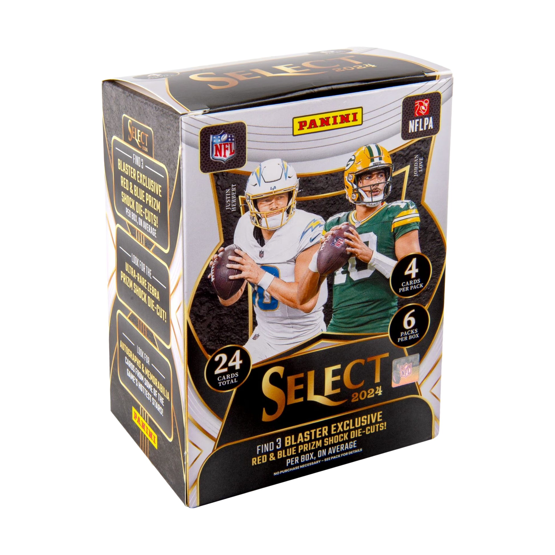Collect the three-tiered base set (Concourse, Premier, and Field Level) with 2024 Panini Select Football! These blasters offer exclusive parallels and top rookies.